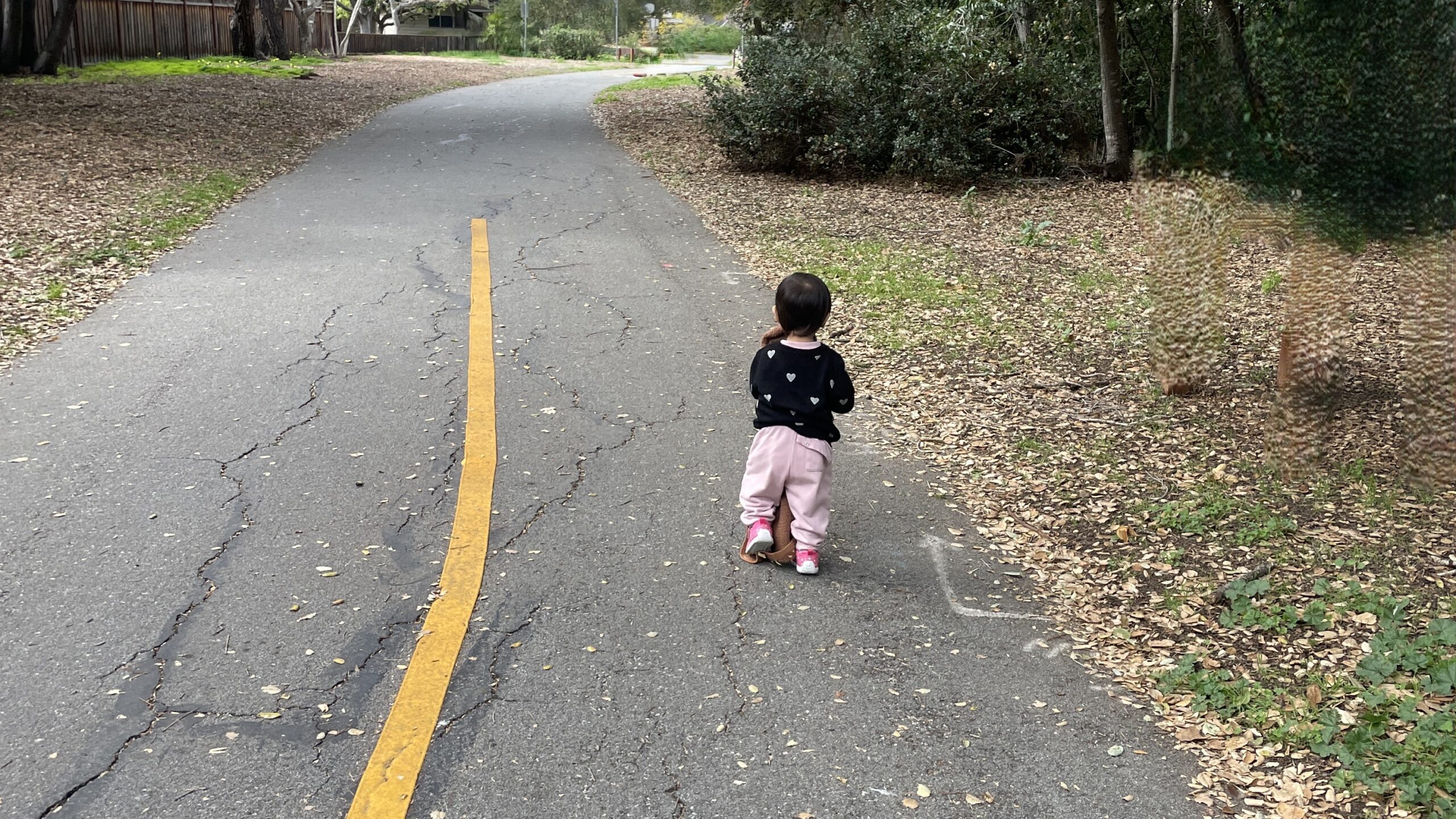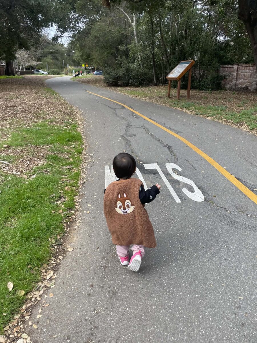 做完家事後,我坐在沙發上念兩本書給她聽。以前保母 11:30 來,我會盡量讓她在保母來前先睡,這樣我能多一點工作時間。現在策略改了——讓她玩到真的累,再好好睡一個長覺。大約 11:30,春天的陽光開始溫暖。我帶她到家旁邊的腳踏車步道散步。她聞花、摘葉子、說要脫掉背心,然後又說著:「cold、cold。」再把背心穿上,最後半逼迫的才回家。